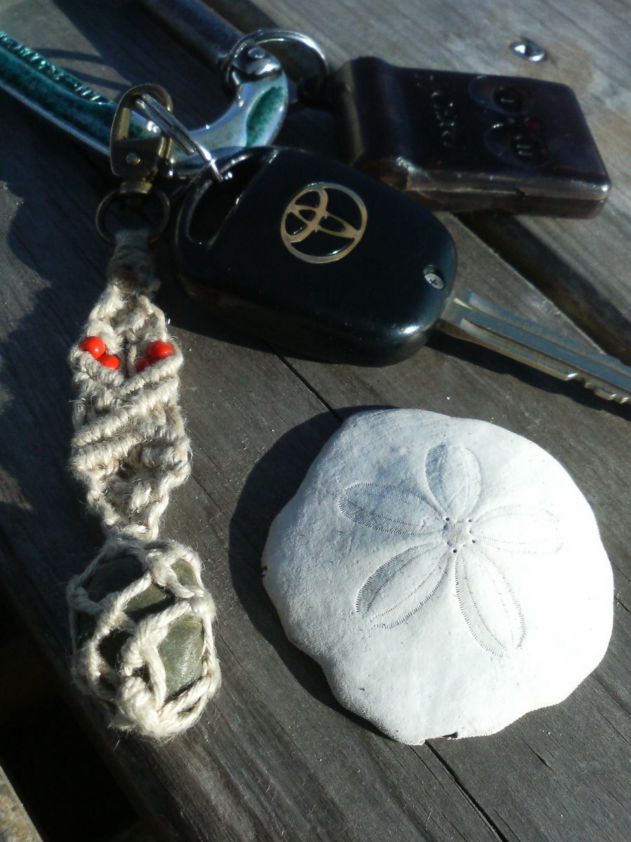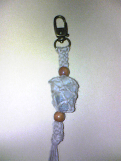 それで、新しく作ったのが、包んだ石の上下にウッドビーズを付けて、前よりキーホルダーっぽく。