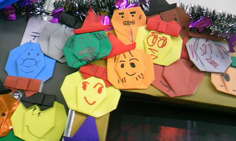 仕事場に子供が遊ぶ休憩所があるので、そこに折り紙のかぼちゃを作って、顔を書いてもらうようにペンを置きました。