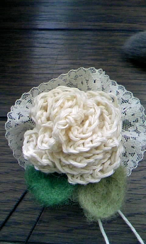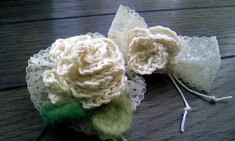 最初、右側のコサージュだけ作ったのですが、ボリュームがいまいちなかったので、花びらを増やしてもうひとつ編んでみました。